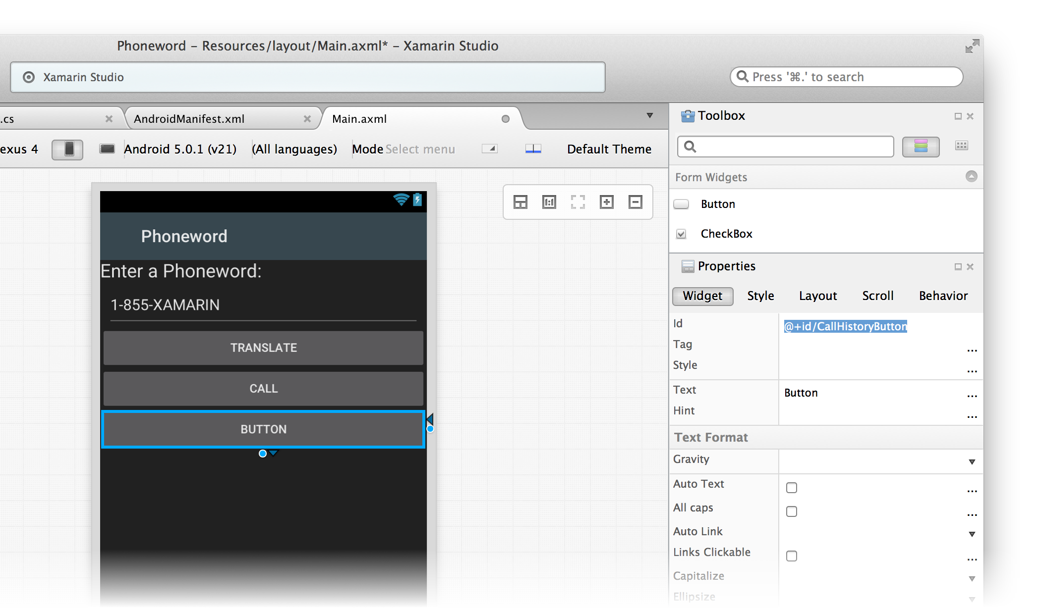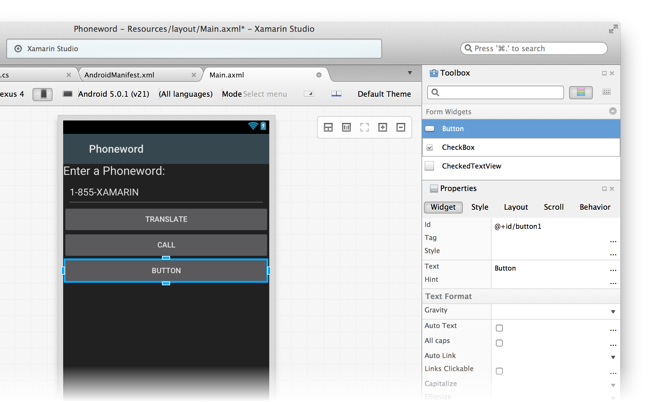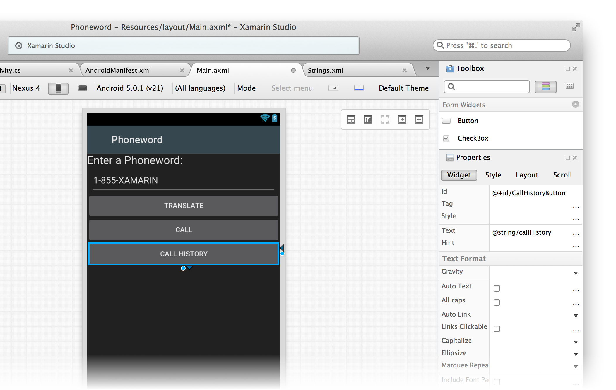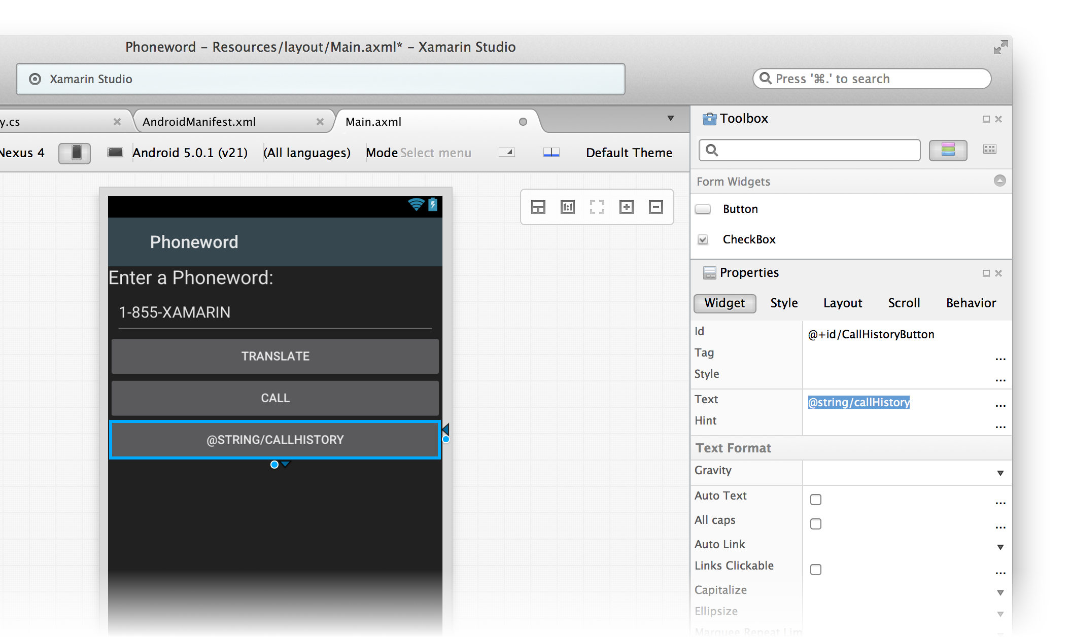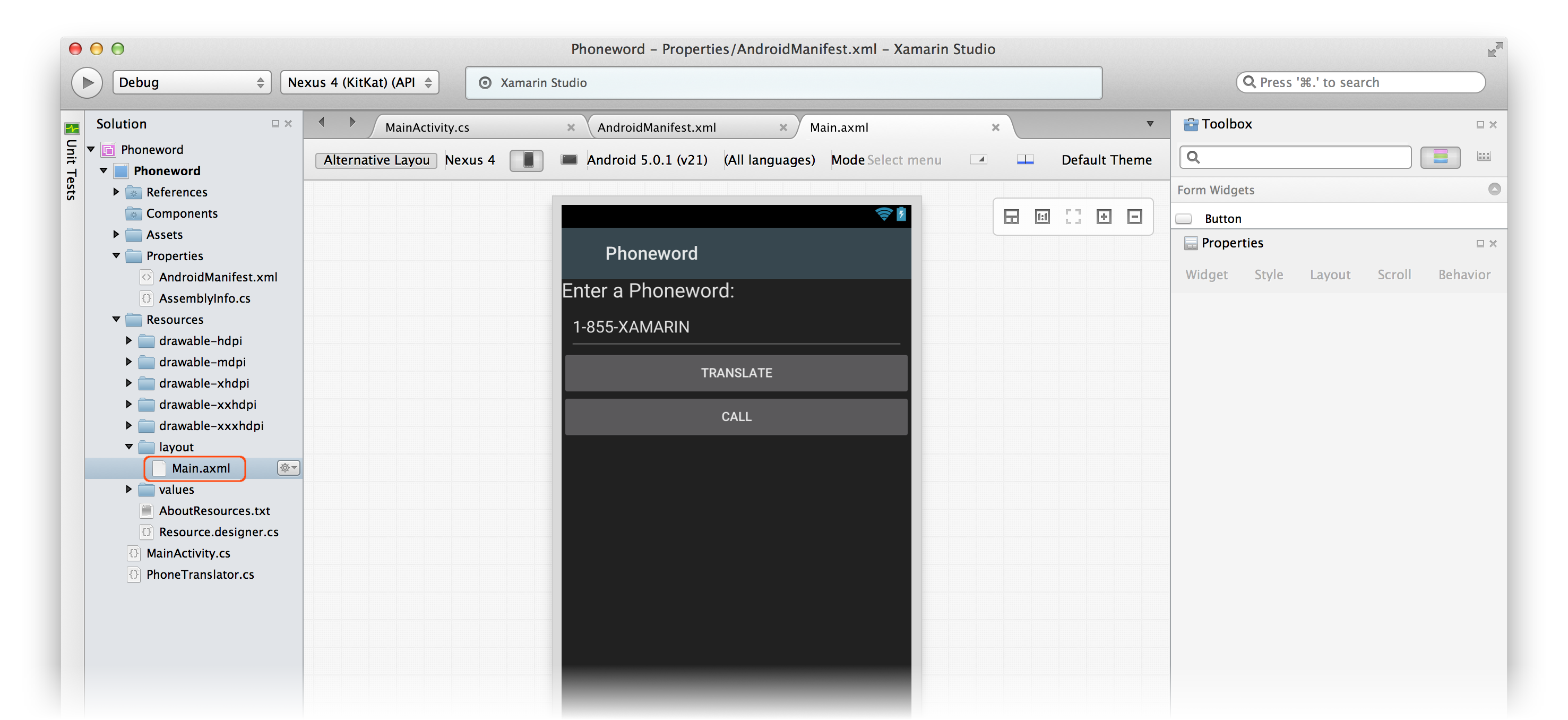 Let’s start by editing the user interface. Open the Main.axml file from the Solution Pad: