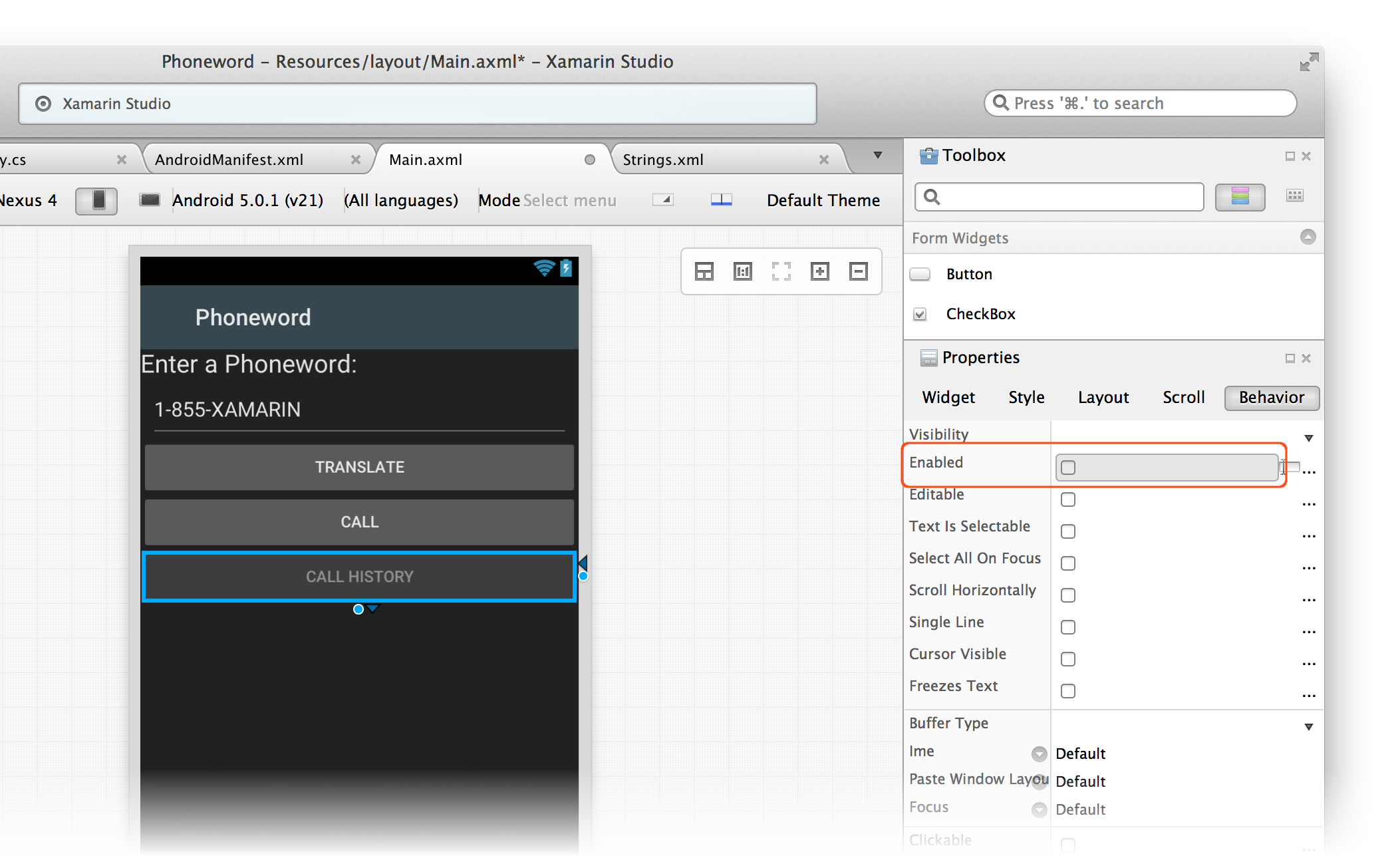 With the Call History button selected on the design surface, open the Behavior tab in the Properties Pad and double-click the Enabled checkbox to disable the button. This will cause the button to become darker on the design surface: