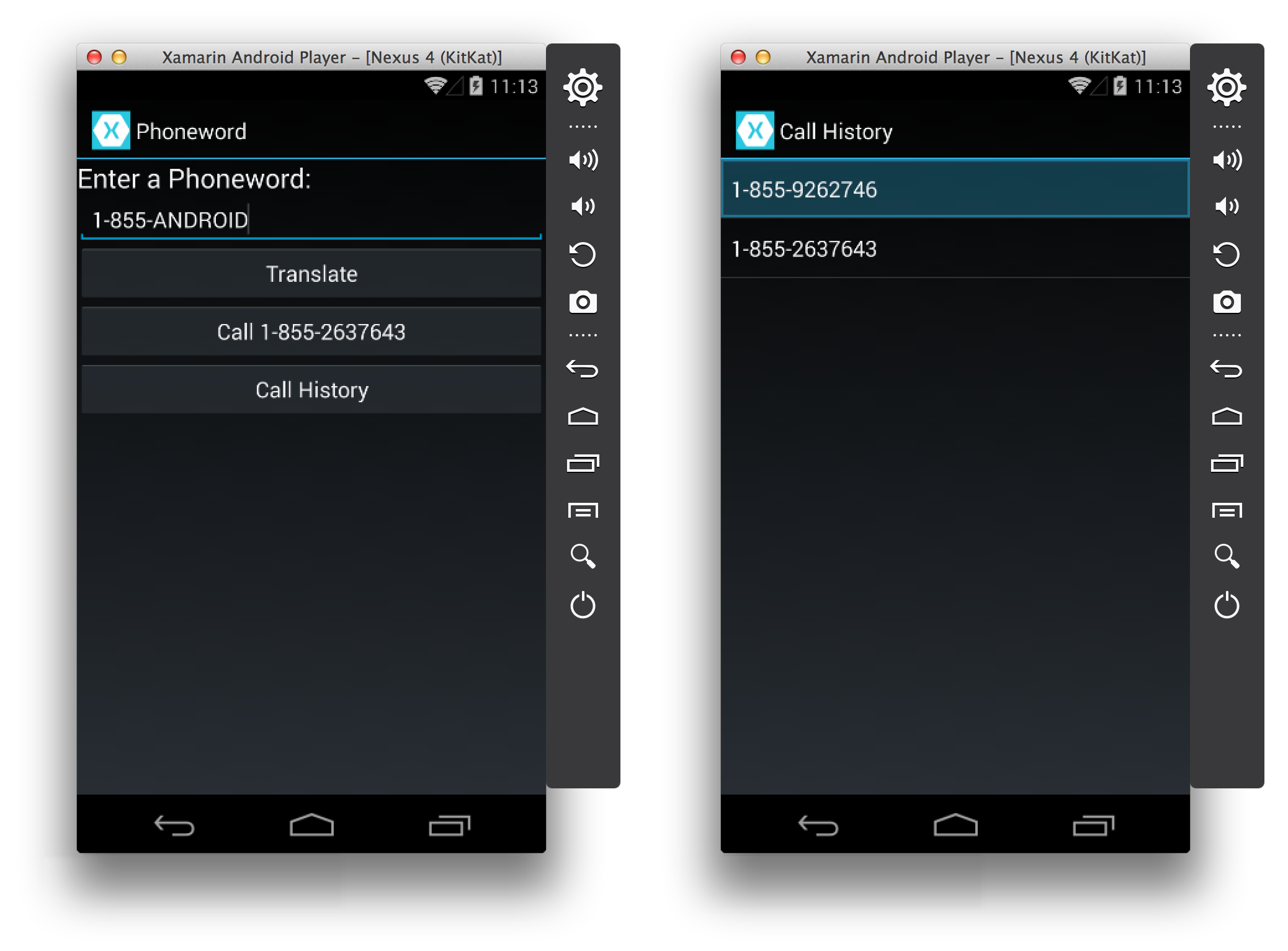 Deploy the application to an emulator or device. The following screenshots illustrate the Phoneword application running in the Xamarin Android Player: