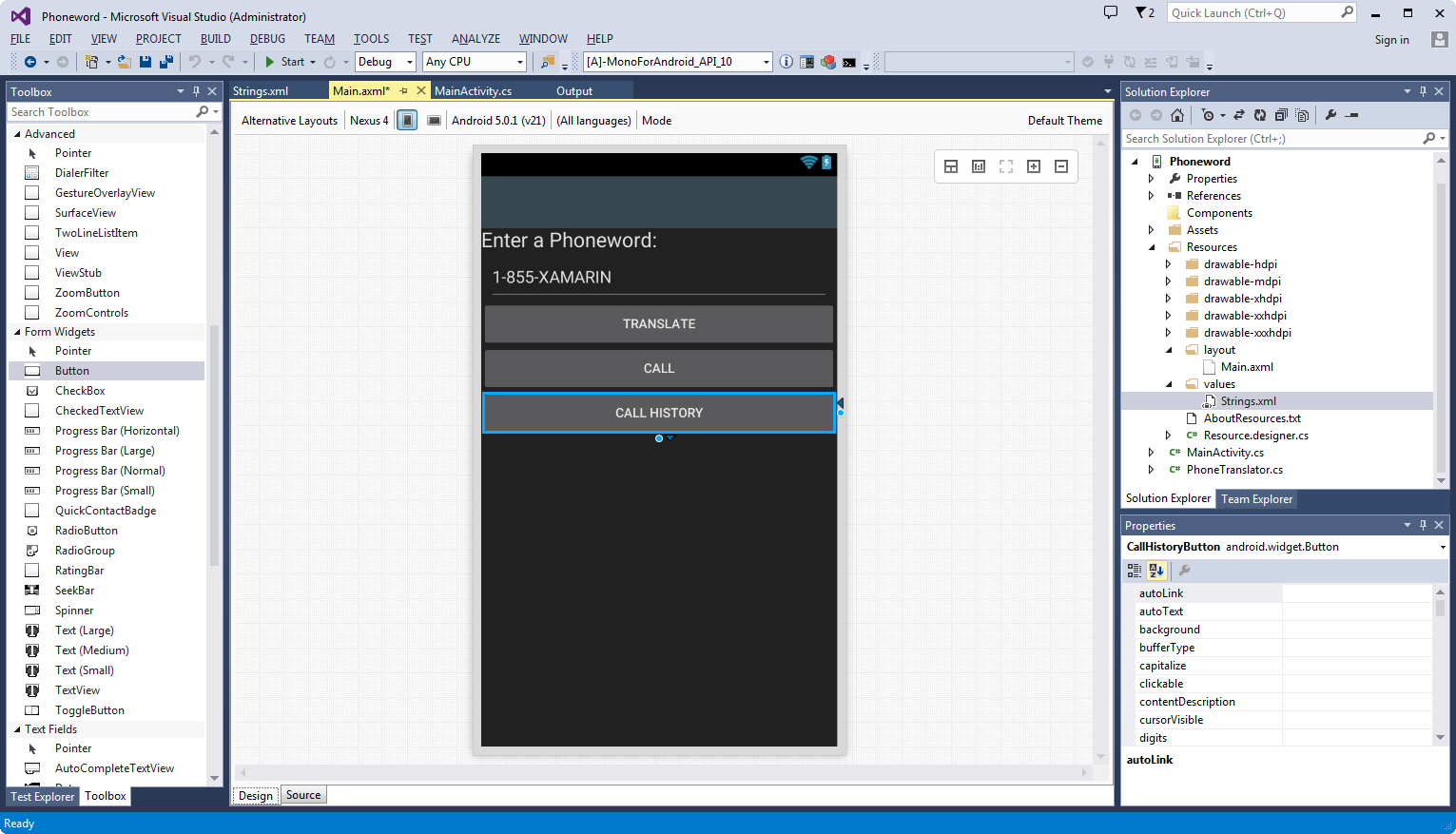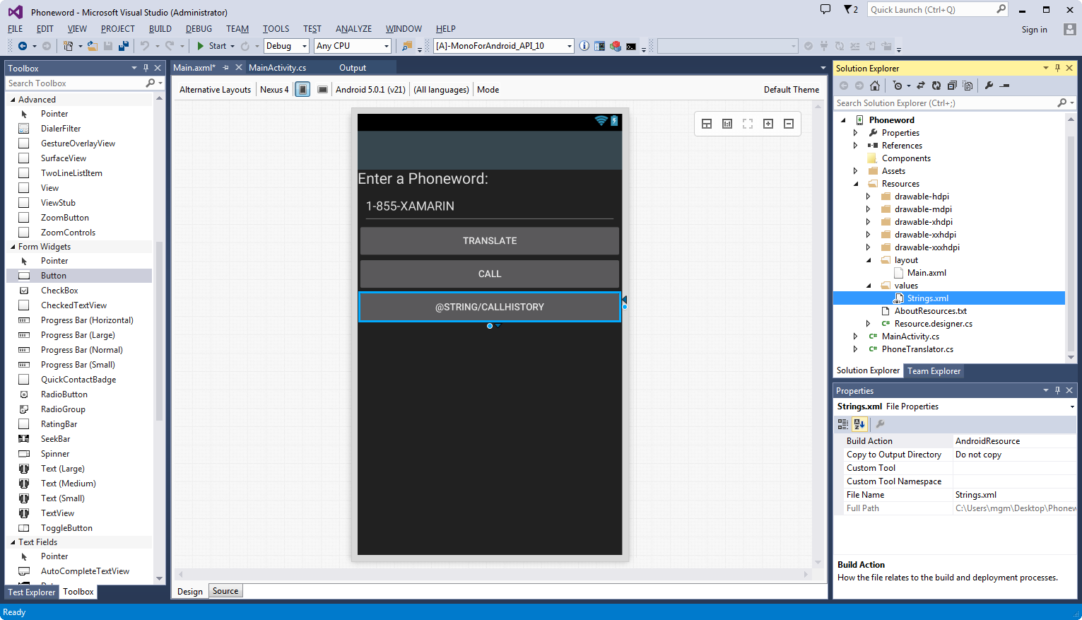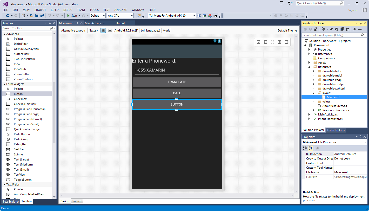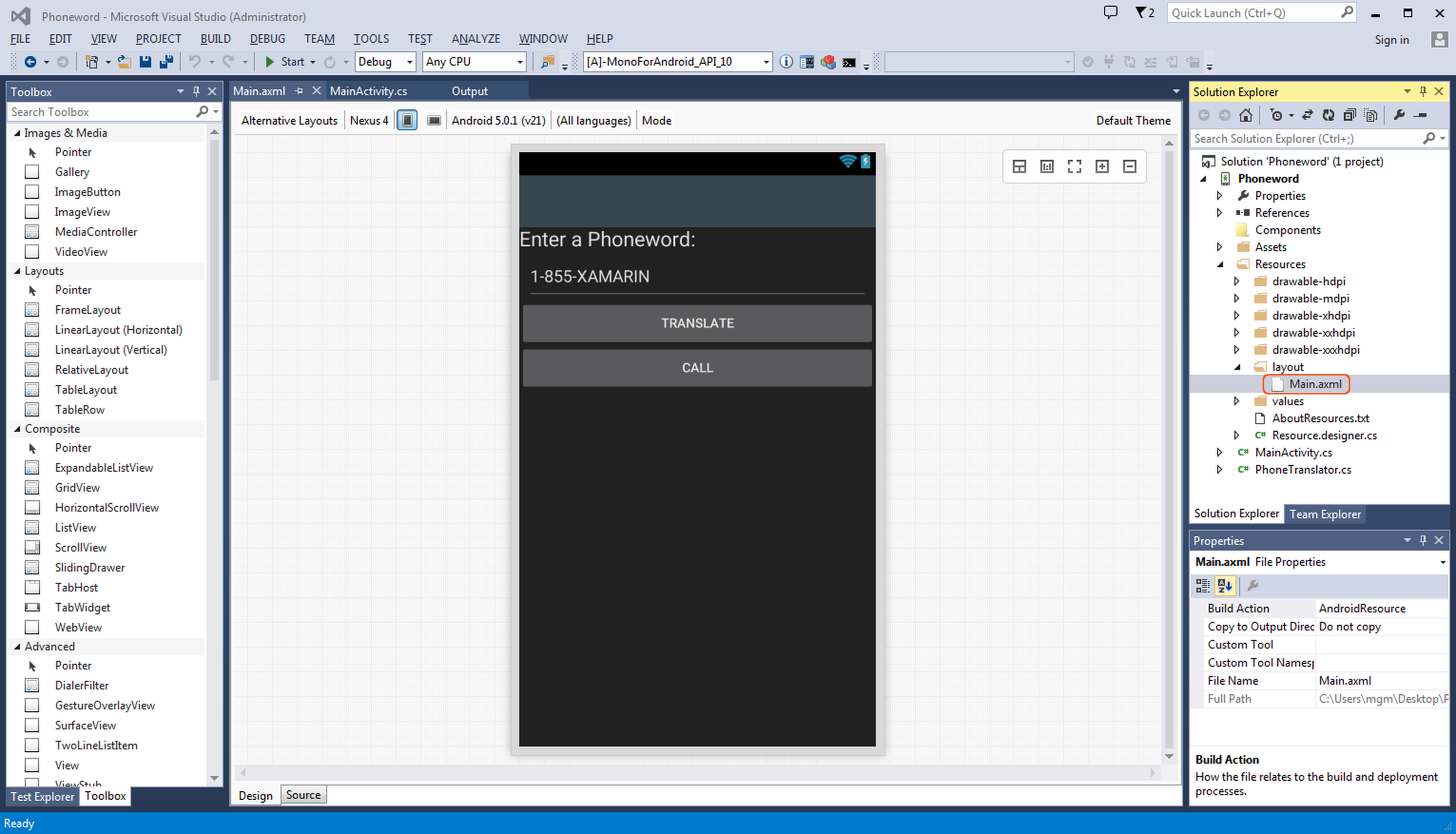 Let’s start by editing the user interface. Open the Main.axml file from the Solution Explorer: