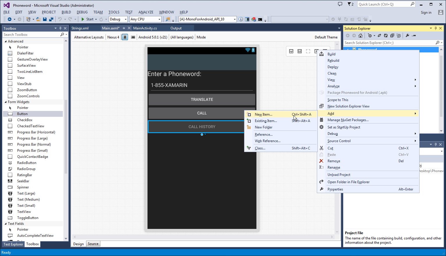 Let’s create a second Activity to power the second screen. In the Solution Explorer, right-click the Phoneword project and choose Add > New Item...: