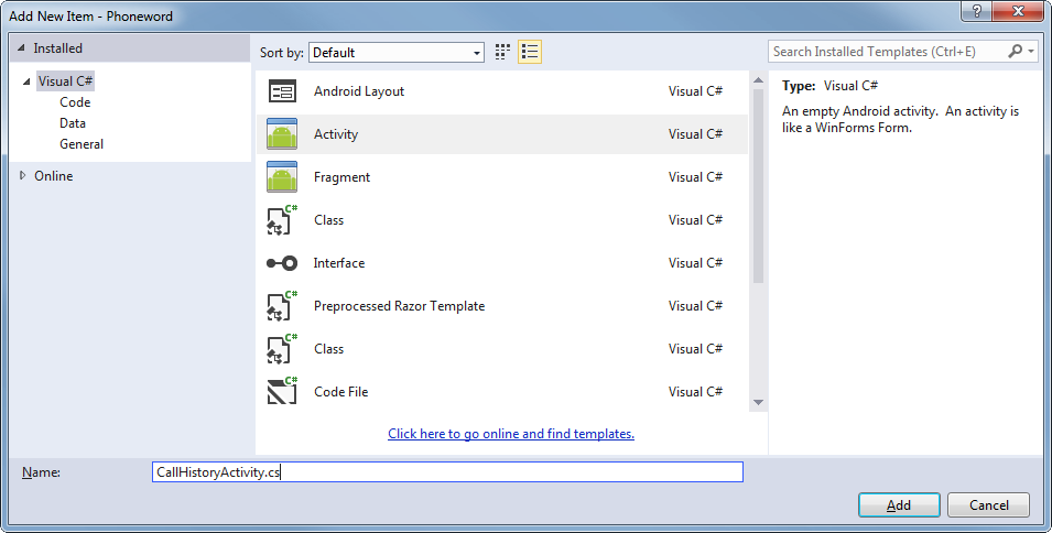In the Add New Item dialog, choose Visual C# > Activity and name the Activity file CallHistoryActivity.cs: