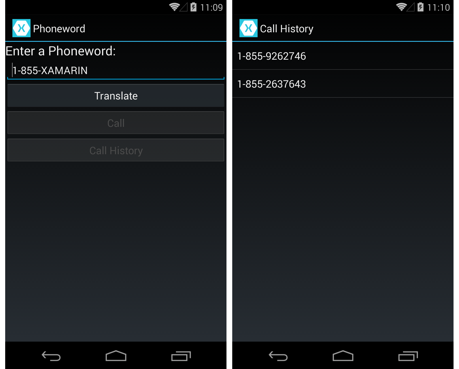 Deploy the application to an emulator or device. The following screenshots illustrate the Phoneword application running in the Xamarin Android Player: