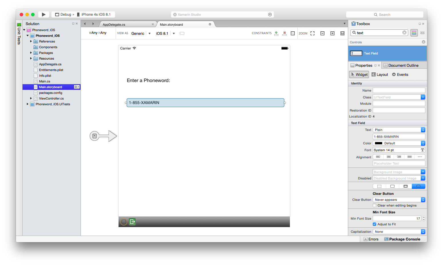 With the Text Field selected on the design surface, change the Text Field’s Name property in the Identity section of the Properties Pad to PhoneNumberText, and change the Title property to "1-855-XAMARIN":
