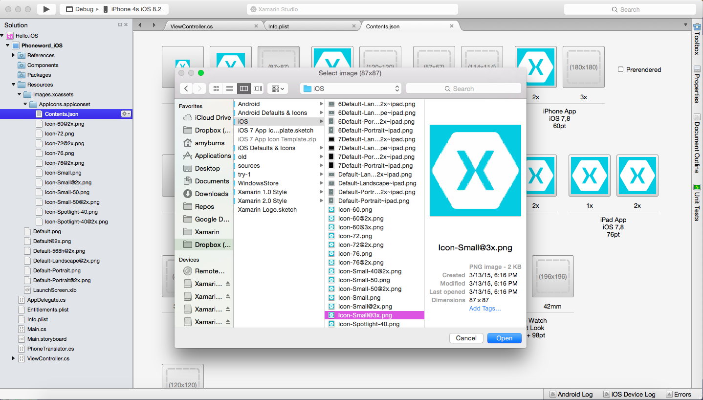 To set application icons and launch images, first download the Xamarin App Icons & Launch Screens set. As we are using Asset Catalog to manage our icons, navigate to Resources > Images.xcassets > AppIcons.appiconset in our Solution Pad, and the open contents.json file. In the iPhone Icons section, click directly on the (57x57) icon placeholder and select the matching icon from the Xamarin App Icons & Launch Images directory: