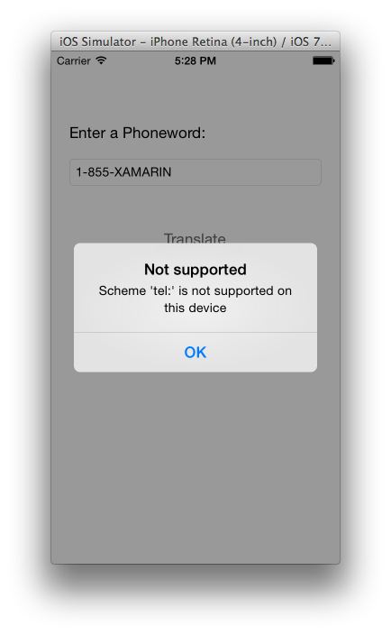Phone calls are not supported in the iOS Simulator; instead, we’ll see our alert dialog when we try to place a call: