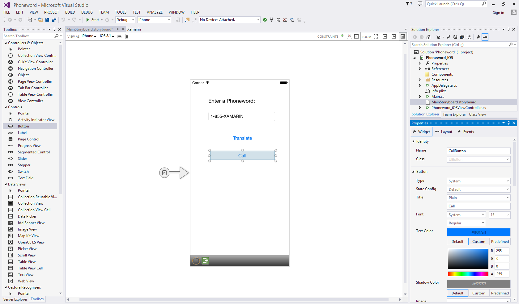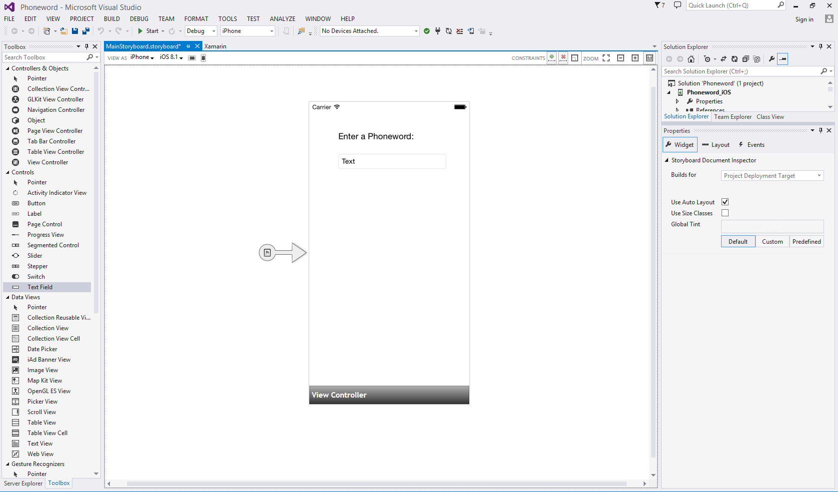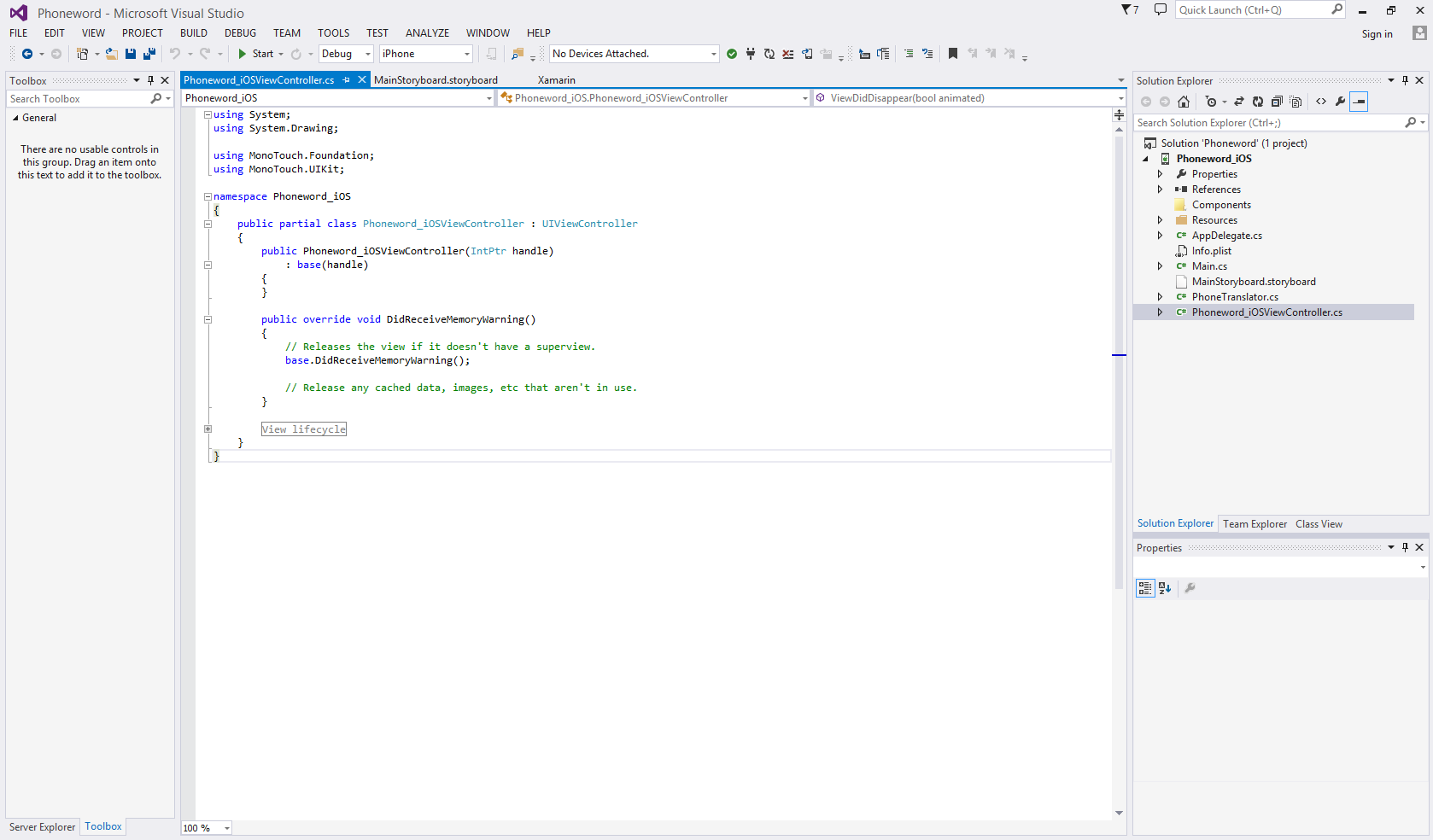 Next we’re going to add code to wire up the user interface. Let’s add the backing code into the Phoneword_iOSViewController class. Double-click on Phoneword_iOSViewController.cs in the Solution Explorer to open it: