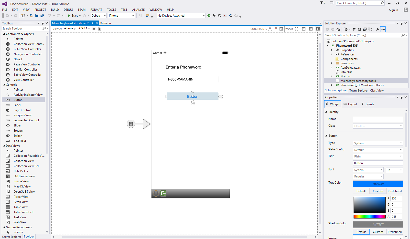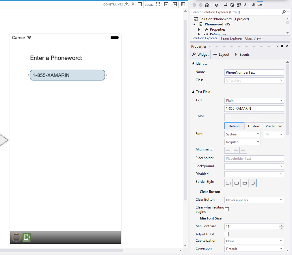 With the Text Field selected on the design surface, change the Text Field’s Name property in the Identity section of the Properties to PhoneNumberText, and change the Title property to "1-855-XAMARIN":