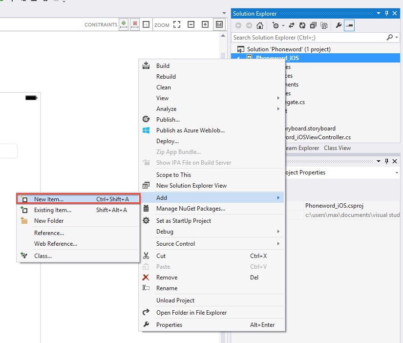 Now, let’s add some code to translate phone numbers from alphanumeric to numeric. We’ll add a new file to the Project by right-clicking on the Phoneword_iOS Project in the Solution Explorer and choosing Add > New File... or pressing Ctrl + n: