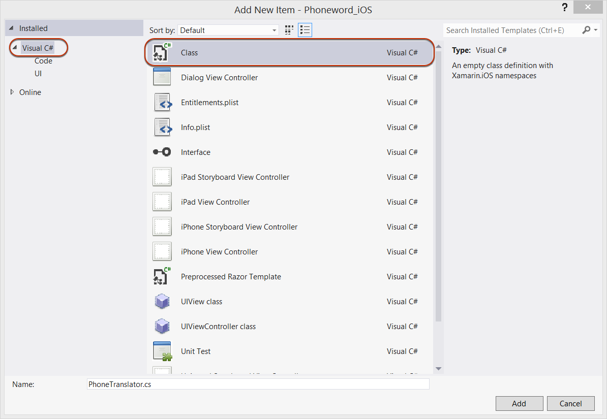 In the New File dialog, select Visual C# > Empty Class and name the new file PhoneTranslator: