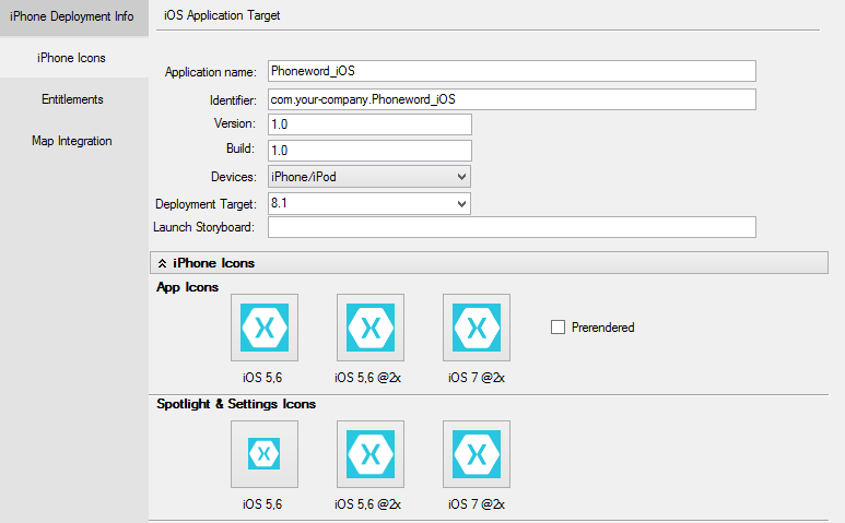 To set application icons and launch images, first download the Xamarin App Icons & Launch Screens set. In the iPhone Icons section, click directly on the (57x57) icon placeholder and select the matching icon from the Xamarin App Icons & Launch Images directory: