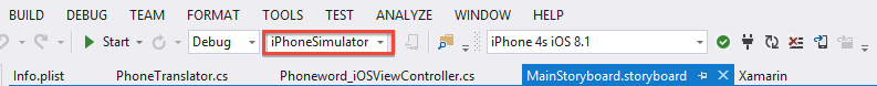 Finally, let’s test our application in the iOS Simulator. In the IDE toolbar, choose Debug and iPhone Retina (4-inch) iOS 7.x from the drop down menus, and press Start (the green triangle that resembles a Play button):