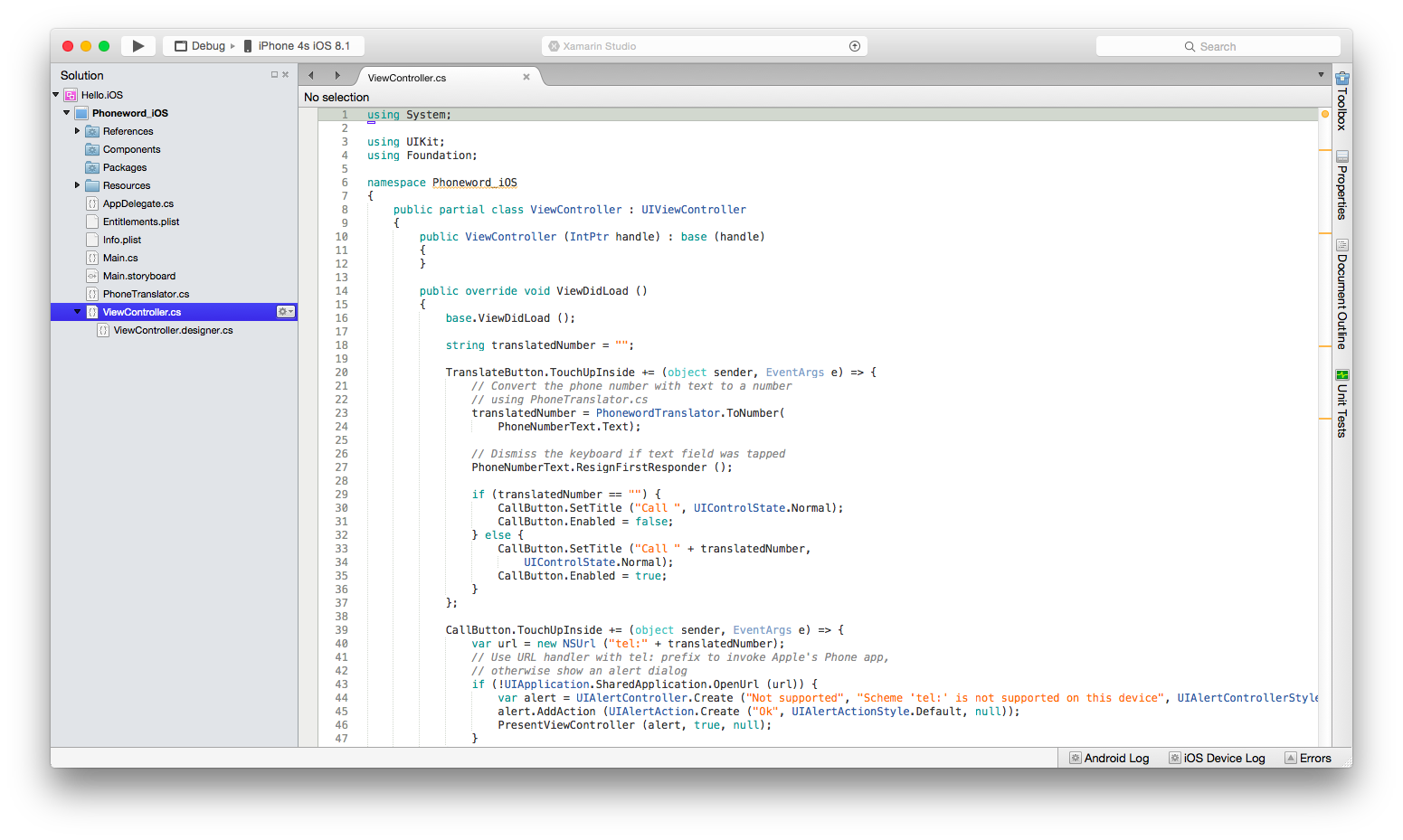 Let’s open the Phoneword application in Xamarin Studio. If you haven’t completed the Hello, iOS walkthrough, you can download the completed Phoneword application here: