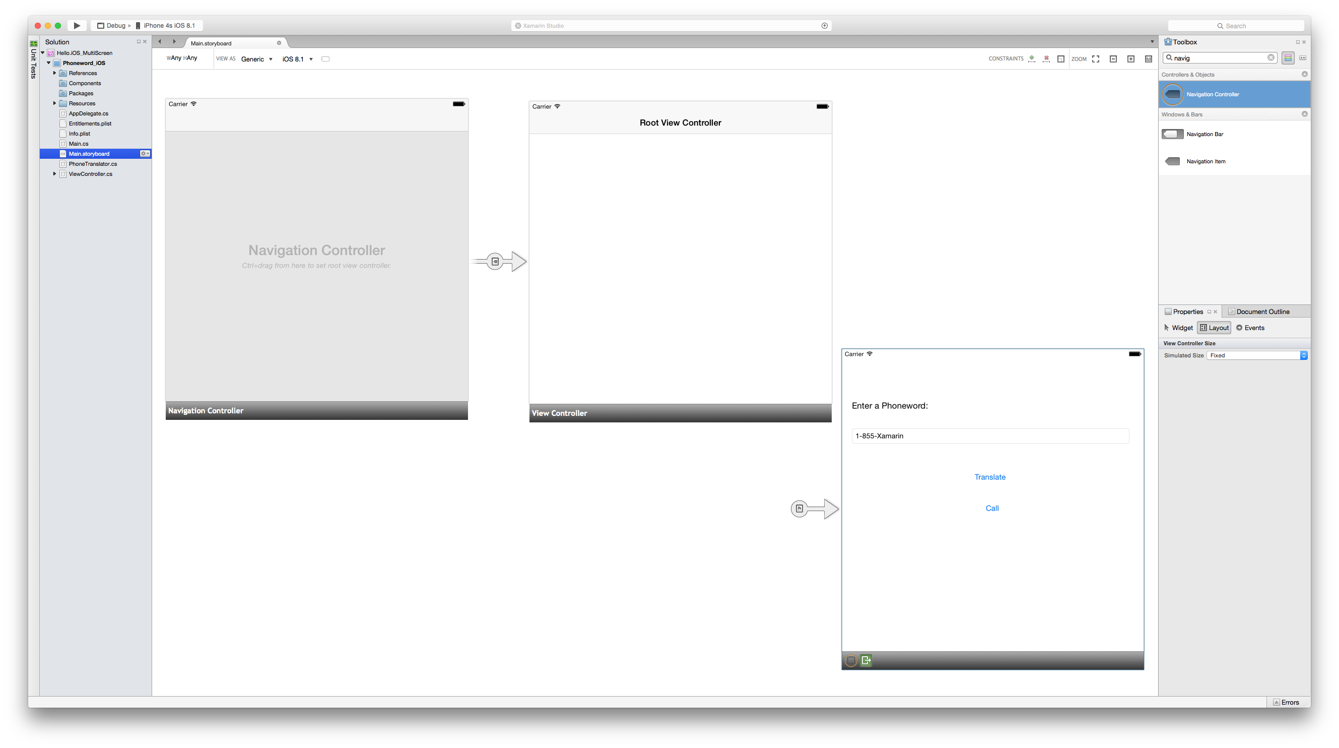 In the walkthrough above, we created navigation between the Phoneword and Call History screens using a Storyboard Segue. Segues are great at handling simple navigation that requires moving from one screen to the next. Segues are not good at handling more complex navigation – for example, conditional navigation when the second screen may be different depending on the user’s behavior on the first screen. In this walkthrough, we’ll learn to handle navigation between screens programmatically.