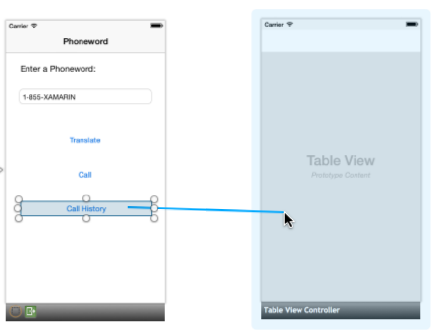 Let’s create a Segue (transition) between the Phoneword Scene and the Call History Scene.
