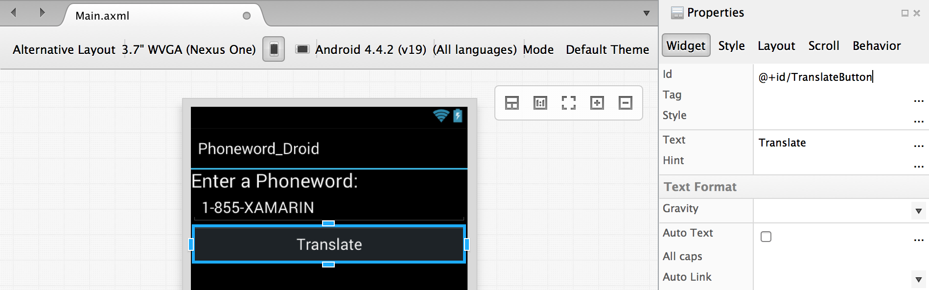 When we set the ID property of the TranslateButton, the Android designer maps the TranslateButton control to the `Resource` class and assigns it a *resource ID* of `TranslateButton`. This mapping of visual control to class makes it possible for us to locate and use the TranslateButton and other controls in our code. We’ll cover this in more detail when we break apart the code that powers our controls. All you need to know for now is that the code representation of a control is linked to the visual representation of the control in the designer via the Id property.