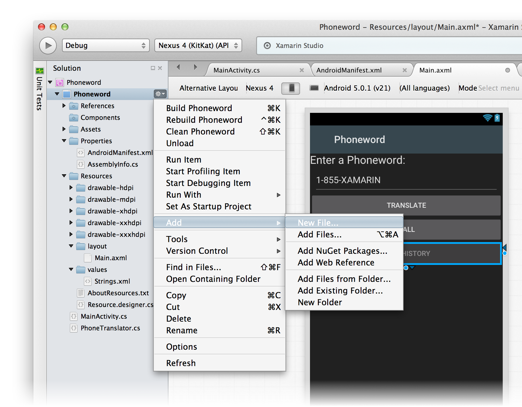 9. Let’s create a second Activity to power the second screen. In the Solution Pad, click the gray gear icon next to the Phoneword project and choose Add > New File...: