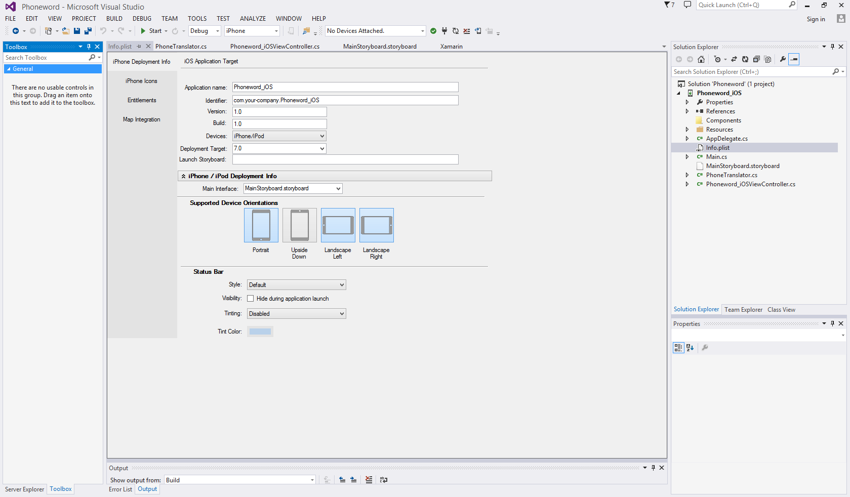 We now have a working application and it’s time to add the finishing touches! We can edit the application name and icons in the Info.plist file. Let’s open Info.plist by double-clicking on it in the Solution Explorer: