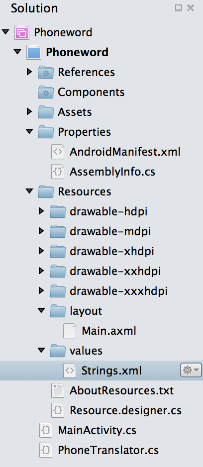 Expand the values node under the Resources folder in the Solution Pad and double-click the string resources file, Strings.xml: