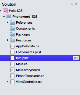 We now have a working application and it’s time to add the finishing touches! We can edit the application name and icons in the Info.plist file. Let’s open Info.plist by double-clicking on it in the Solution Pad: