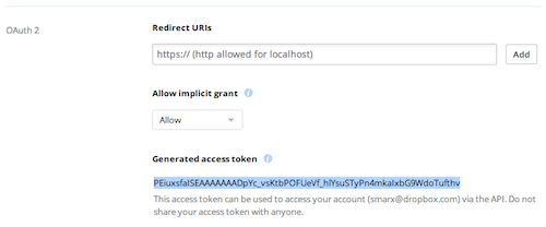 Generate an OAuth access token for your Dropbox account by clicking the "Generate" button in the App Console.