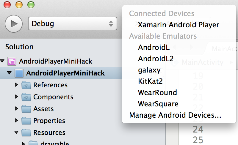 • Open AndroidPlayerMiniHack.sln in Visual Studio or Xamarin Studio