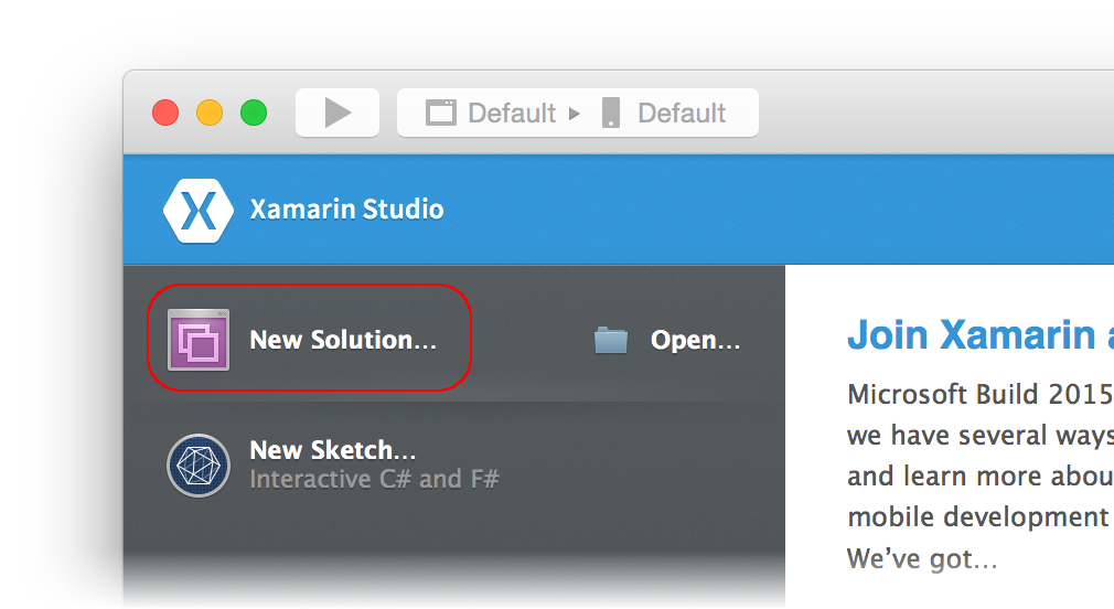 Let's launch Xamarin Studio from the Applications folder or from Spotlight. This opens the start page: