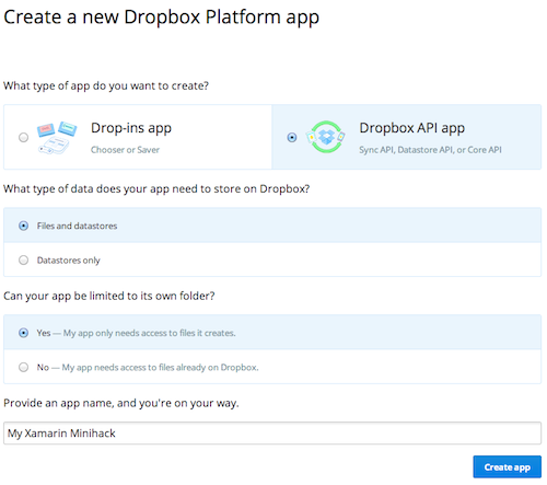 Sign up for a free Dropbox account if you haven't already, and create a new app via the Dropbox App Console. Make sure your app is a "Dropbox API" app and has access to files (not just datastores), as in the image below:
